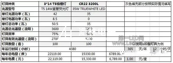 此時(shí),只要對(duì)應(yīng)3*14W的替換型LED燈具的燈具效能高于49.9lm/W,我們就可以說它相對(duì)于原來的格柵燈來說是節(jié)能的。舉例如下: